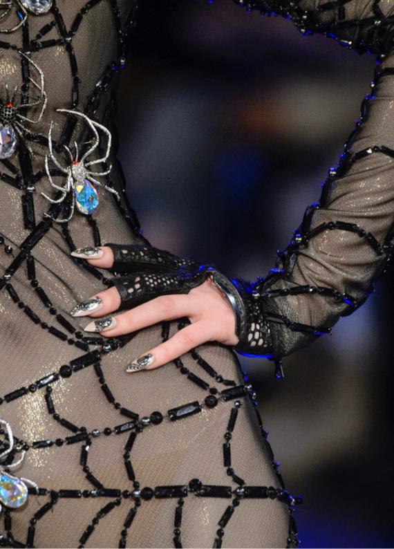 秀场上可见黑色服装模特常配上一款纯黑手套,但为不影响整个造型过于生硬,也可配上纯黑网纱手套,不仅将模特手部展现,更具灵动感,而也存在黑色服装搭配花色手套,主要为了两者色觉的撞色感